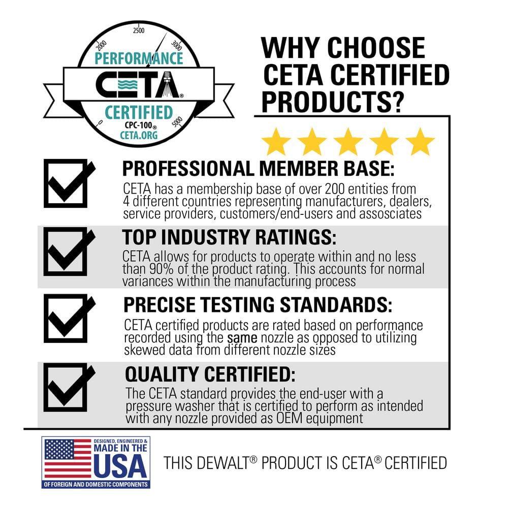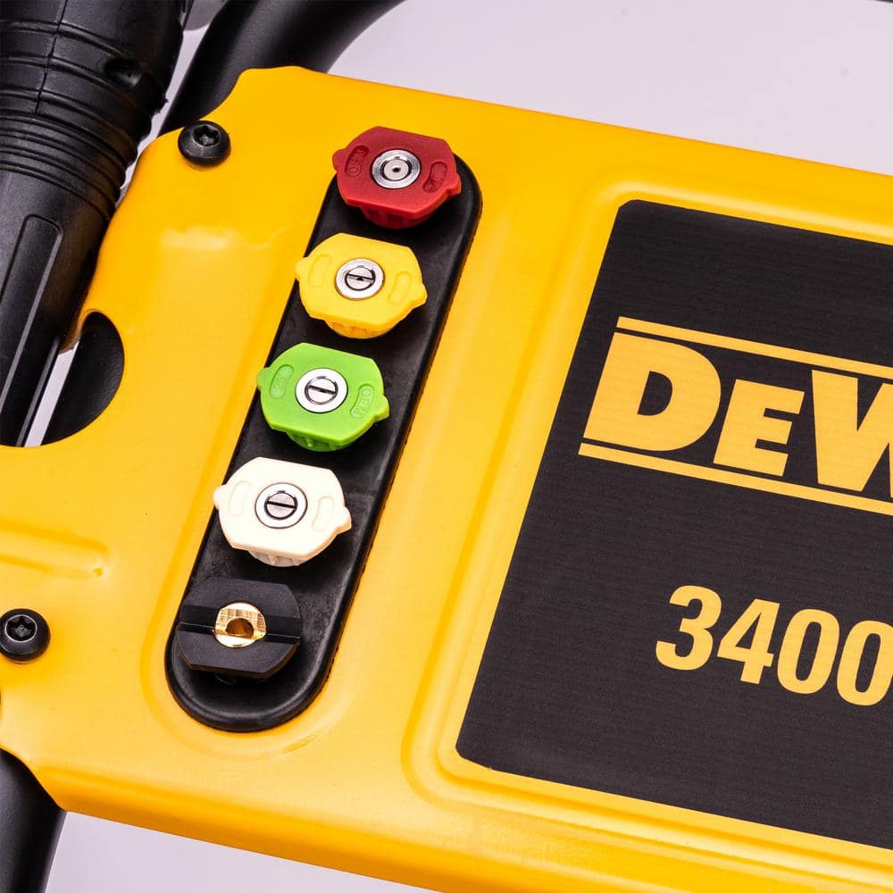 DEWALT pressure washers deliver high performance and maximum power straight from the box. The Pressure Ready cold water gas pressure washer comes equipped with 4 stainless steel quick connect nozzles (CETA certified 3400 psi at 2.5 GPM) and is built to perform for your professional tasks. Great for cleaning equipment, wood structures, driveways and vinyl siding. Ideal for mid to heavy portable power washing needs. DEWALT offers sturdy, reliable high pressure cleaners that are easy-to-assemble, easy to start and easy to store. They are perfect for industrial pressure washing, commercial pressure washing and residential pressure washing.