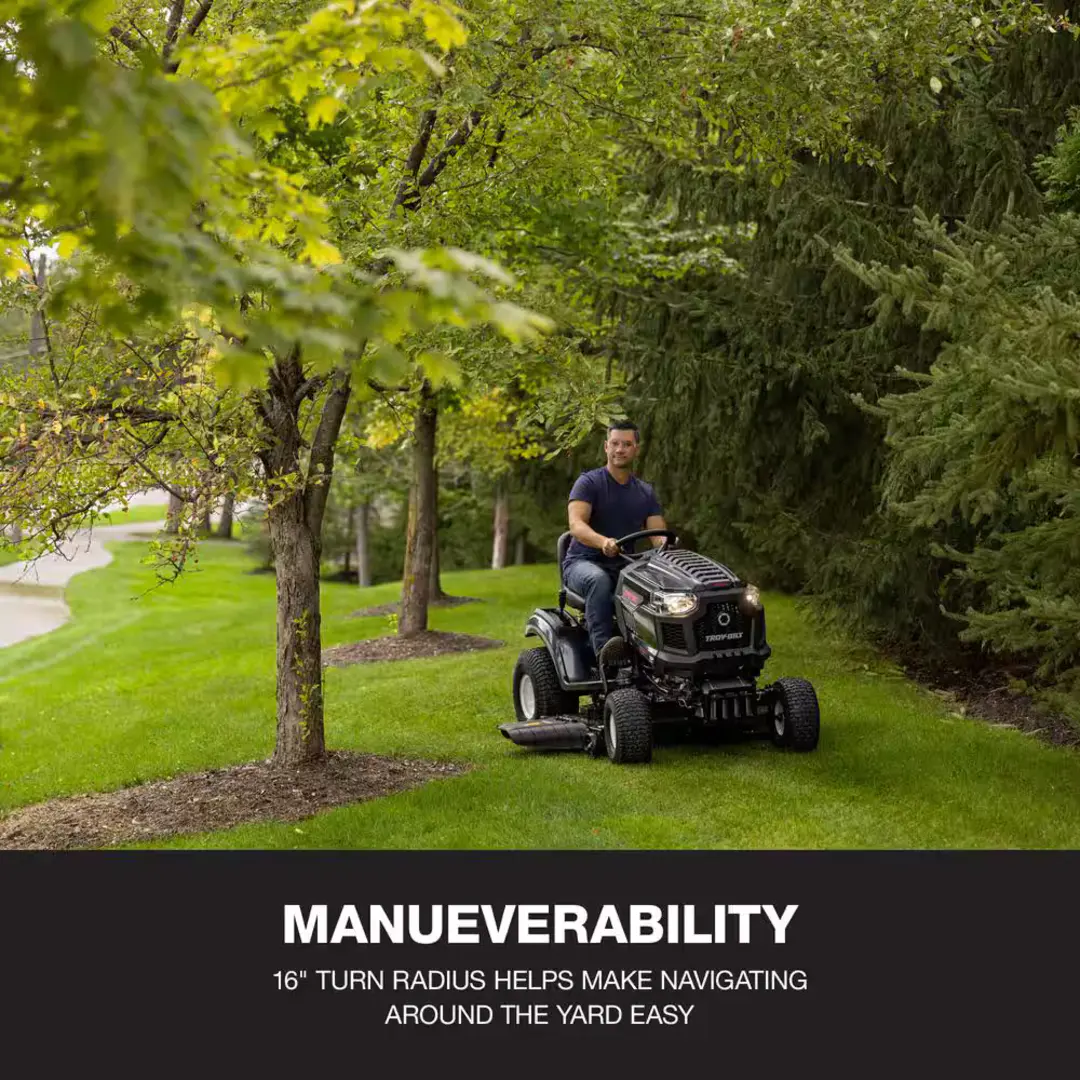 Adjustable Cutting Height, Adjustable Speed, Assembly Required, Battery level indicator, Built-in Hitch, Cruise Control, Cup Holder, Deck cleanout, Headlights, Hour Meter, Keyed start, Pneumatic Tires, Residential, Reverse Mowing, Rust resistant deck, Single-lever height adjustment, Translucent Fuel Tank |