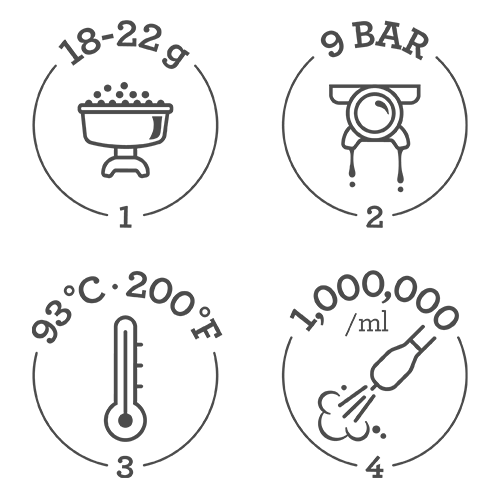 An opulent, creamy and caramel colored espresso starts with low pressure pre-infusions, followed by a high pressure (9 bar) extraction process delivered via our 15 bar Italian pump.