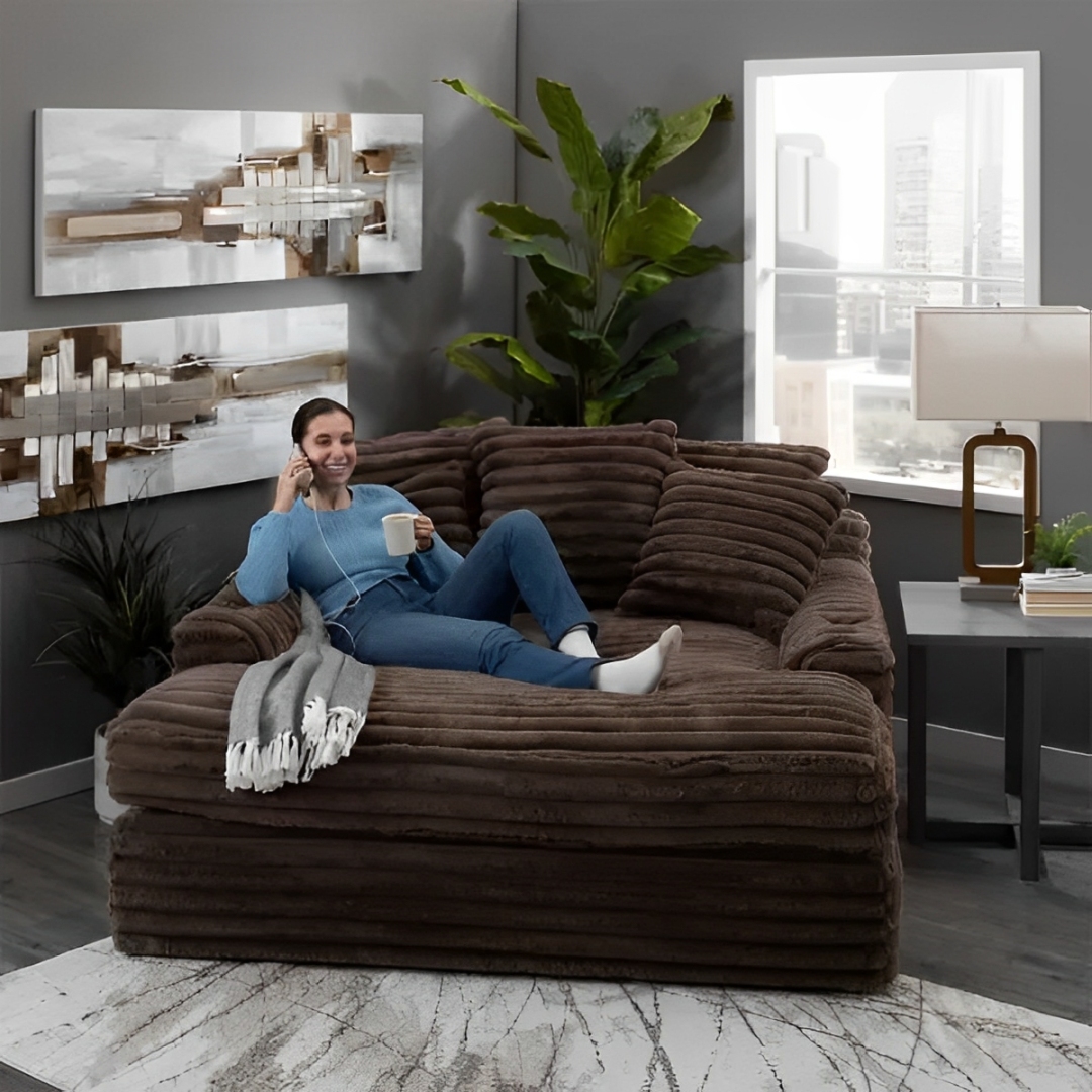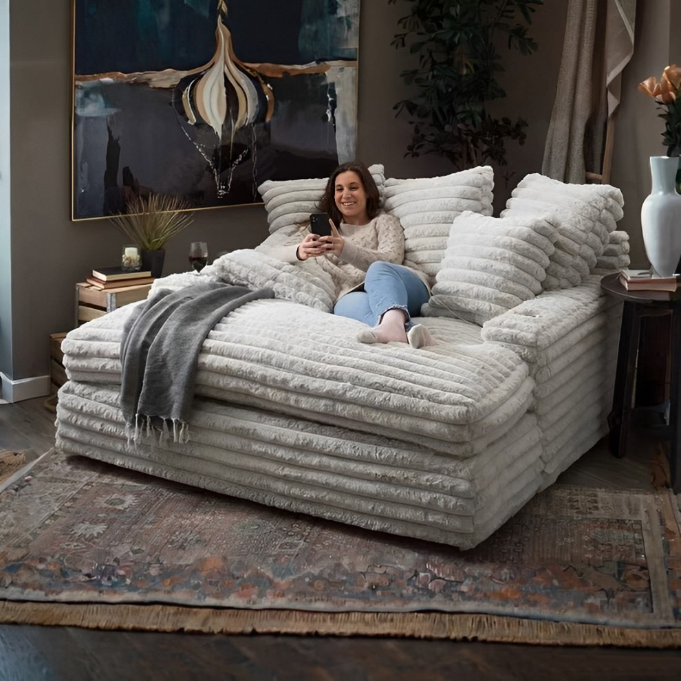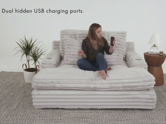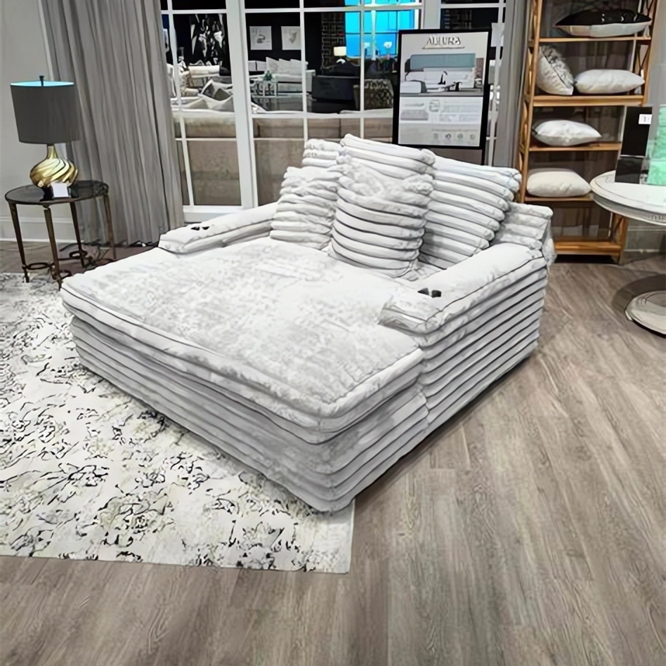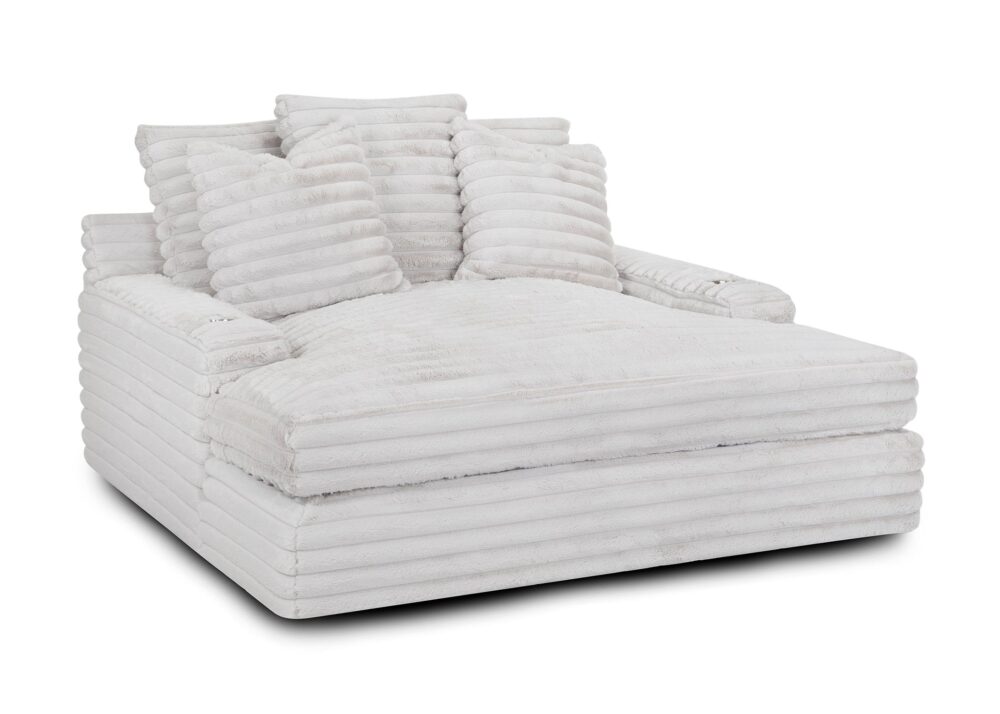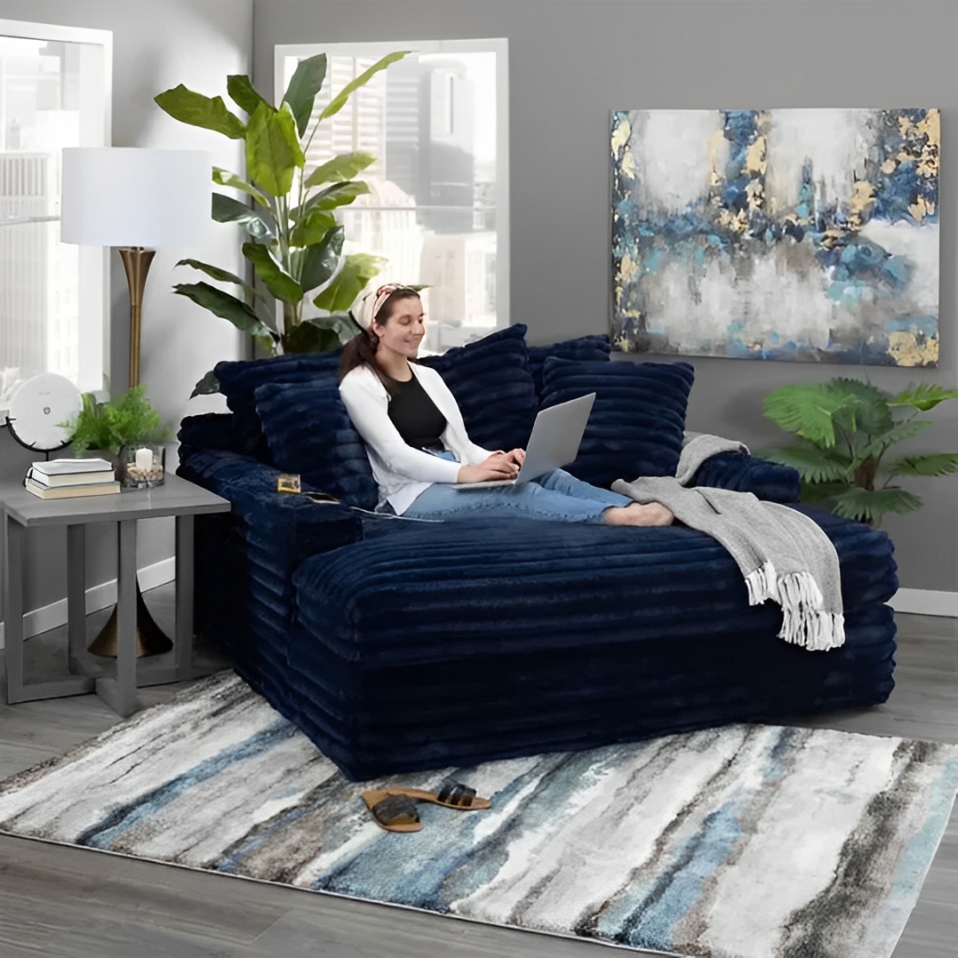 Our chaise lounge is the perfect addition to your living room for ultimate relaxation. Its ultra-dense, soft luxurious feel is made with wide, super soft corduroy fabric that is both durable and stylish. The chaise lounge has a lofty appearance and is accompanied by three back pillows and two down filled toss pillows for added comfort. With two USB ports, you can conveniently charge your electronic devices while lounging. And with two cupholders, you can easily enjoy your favorite beverage without having to get up. Whether you are watching a movie or reading a book, our Chaise Lounge is the perfect spot to unwind and relax.