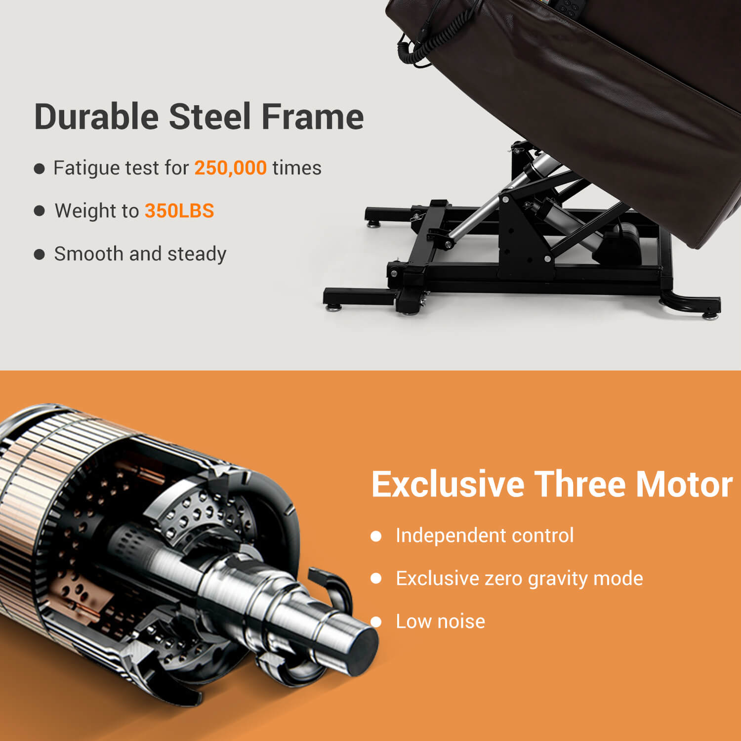 This lift chair is powered by electric and three motor. Each motor extremely quiet, smooth and works independently. The unique feature of the three motors is backrest and footrest can be adjusted individually. You can get any position you want easily.