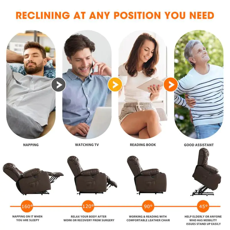 - Power Lift Function-with TUV certification-You can press the button on the right side of the lift chair to control the lift or tilt of the chair, either tilt or lift between 90-160 degrees,whether it's watching TV, reading a book or taking a break,all are ideal for adults, the elderly, the disabled, and pregnant women.