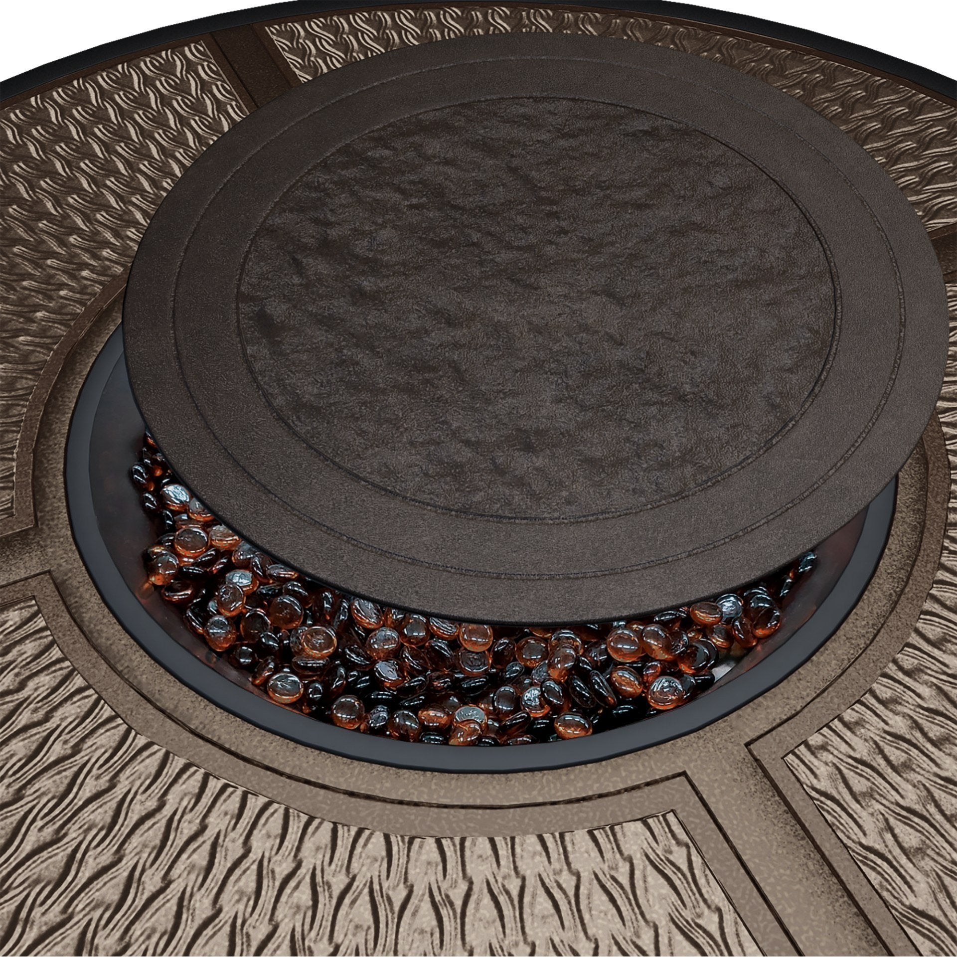This set includes four 360-degree swivel glider chairs that let you rock and sway in comfort for hours. While you're nestled around a circular fire pit with a cast aluminum table top, the inviting ambiance and heat of the easy-to-adjust flame takes centre stage.