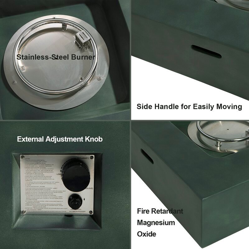 - Fashion Forward Flames: The ultramodern slate gray faux stone appearance is something you'd expect to see in a chic SOHO loft space or art opening with it's simple, unobtrusive cubist style. All built to last from sturdy, fire retardant magnesium oxide with a stainless steel burner bowl. Lights with the push of a button and the flame intensity are controlled by the adjustment knob. Wind guard and waterproof cover for protection.