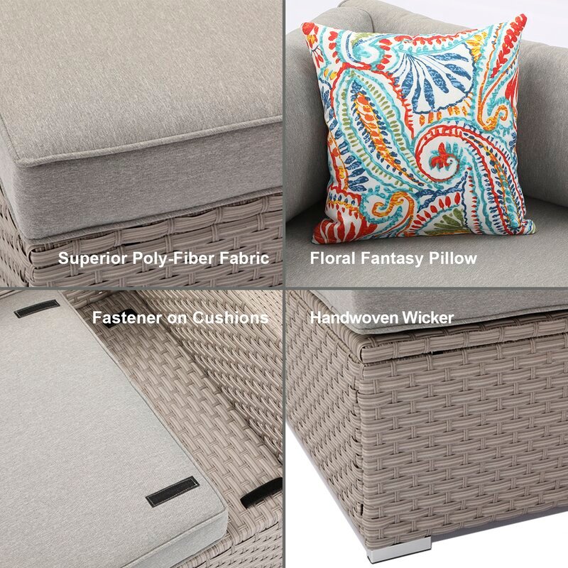 - Stylish Patio Fun: Outdoor comfort never looked so good! Two corner chairs, two middle chairs and two oversized ottomans built from sturdy rust-resistant powder-coated steel and hand-woven in beautiful warm gray all-weather synthetic PE resin wicker. The set comes with an elegant fire table, clean-burning propane flame provides soothing warmth, gentle lighting and a centerpiece for warming up those casual evening get-togethers.