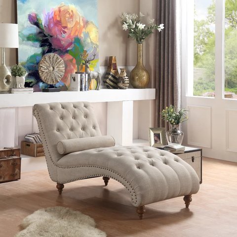 With a silhouette sure to stand out, this curvaceous chaise makes the perfect statement piece in your living room or master suite. Its upholstery showcases dramatic button tufting for traditional glamour. This piece is polished off with turned wooden feet and accented by nailhead trim. But wait, there's more: one matching bolster pillow is also included.