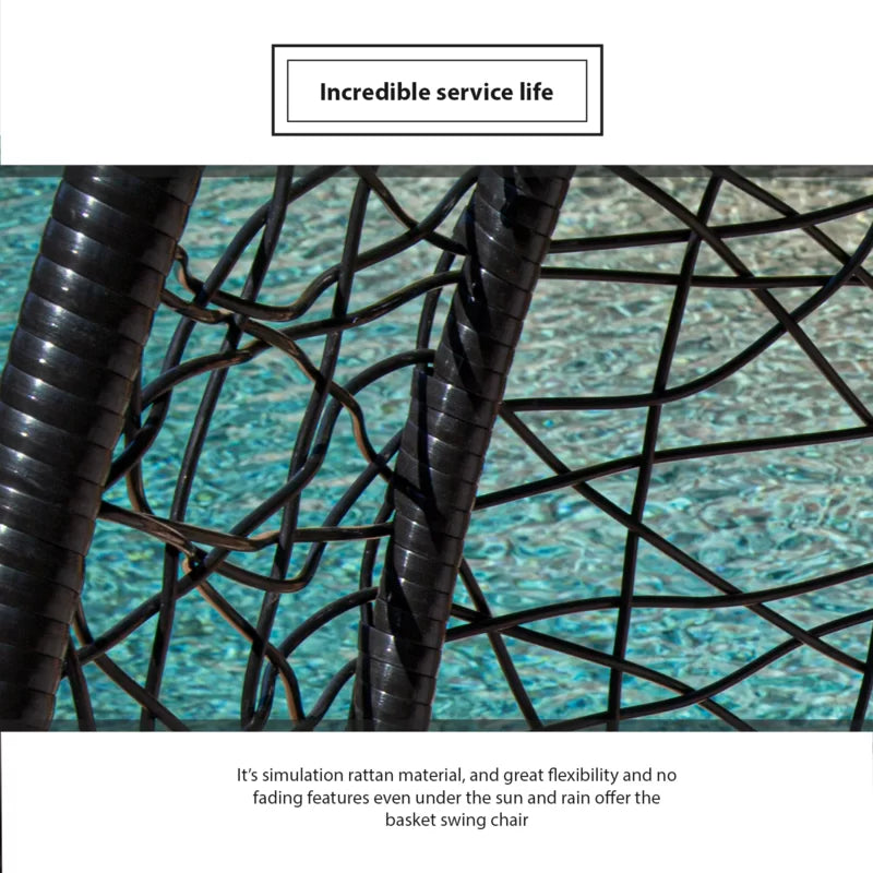 A patio chair with mat inside, great quality, teardrop shape. Outfit your favorite outdoor seating space in this swing chair. Its open design brings breezy flair to any space, while its foam-fill cushion adds a cozy layer to your casual ensemble. Lean into this piece's versatility by adding it to your patio seating space alongside a woven wicker bench for a complementing look. Roll out a weather-resistant trellis rug to tie the space together in a pop of pattern, then dot the space with tiki torches to cast a flickering glow over al fresco dinners or a romantic dinner under-the-stars. Perfect for perching with your latest read and a glass of homemade lemonade, this distinctive design instantly elevates your patio ensemble.